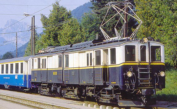 | To haul the "Golden Mountain Pullman Express" MOB purchased two articulated locomotives with luggage compartment designated FZe6/6 No.2001 and 2002. As the express train was discontinued shortly after its inauguration, these locomotives (that measure 17m in length) were used to pull heavy express trains, freight trains or even special trains with the Pullman cars that remained with MOB. |