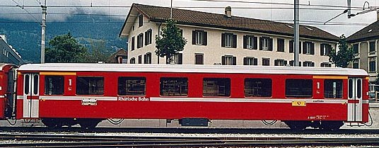 The first passenger coach featuring the RhB's latest corporate identity is A1227. The new design is not only characterized by a broadened silver line continuing to the doors and with incorporated Graubünden-logo but also by the missing RhB-logo in the trilingual lettering.