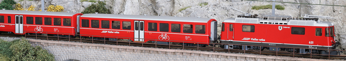 Typical train composition:- a railcar ABe4/4, a green/cream steel B coach, a red centre-door B coach,